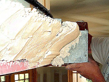 With this project the designer wanted a moulding installed that would house a light trough. The soffit was an asymmetric curved surface which created a challenge to run in place. We designed the moulding profile and did all preparatory carpentry necessary to install the moulding. In the first photo you can see the knife and the first few coats of base coat. The second photo shows the moulding in its near finished stages. The final photo shows the soffit curves. If you are wondering about the black piping under and over the moulding that is what we use as a running rail, and is removed when finished.